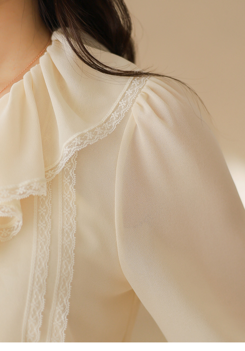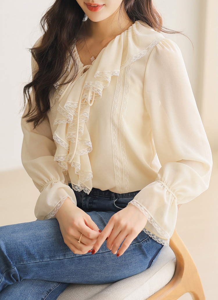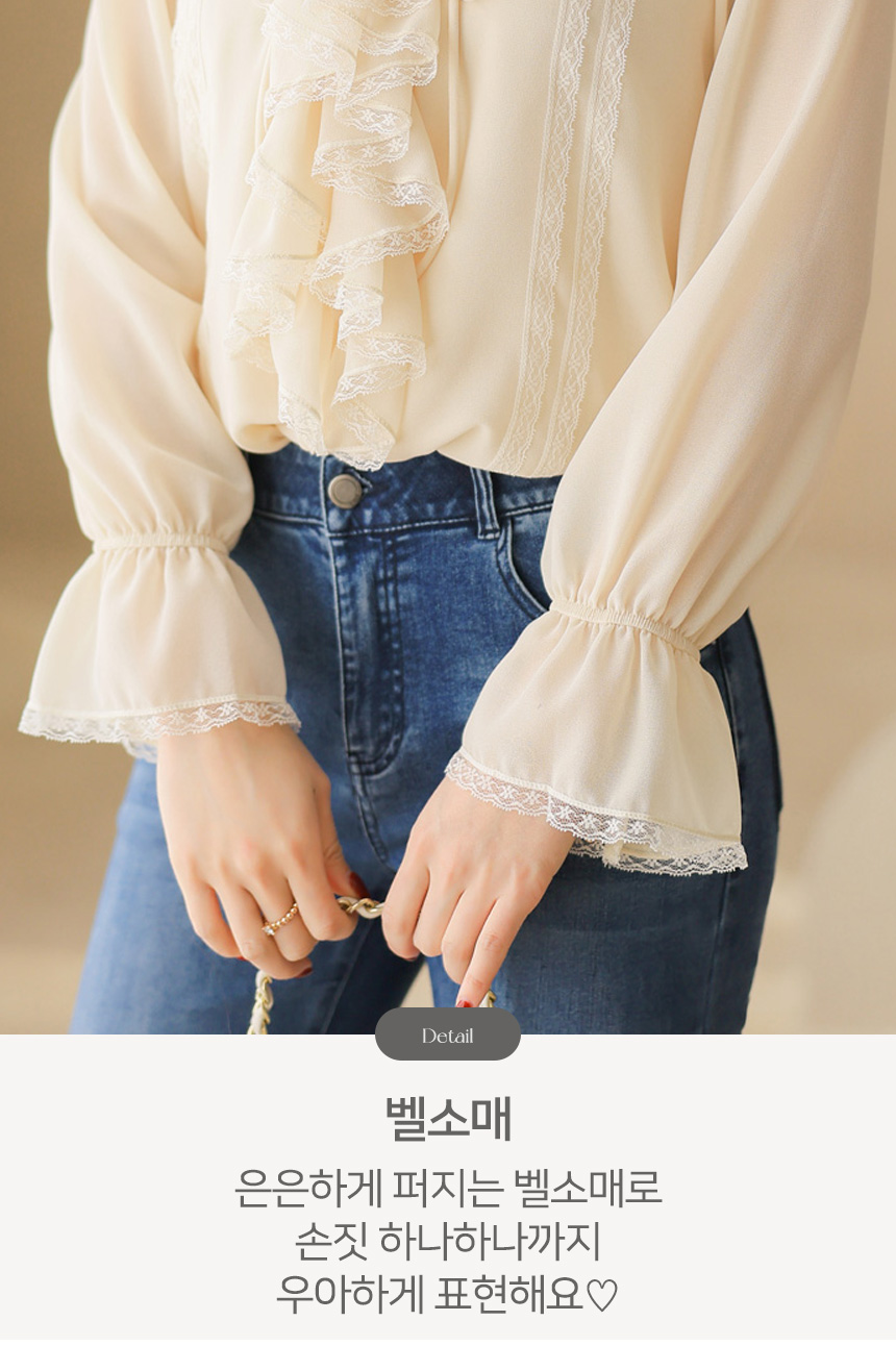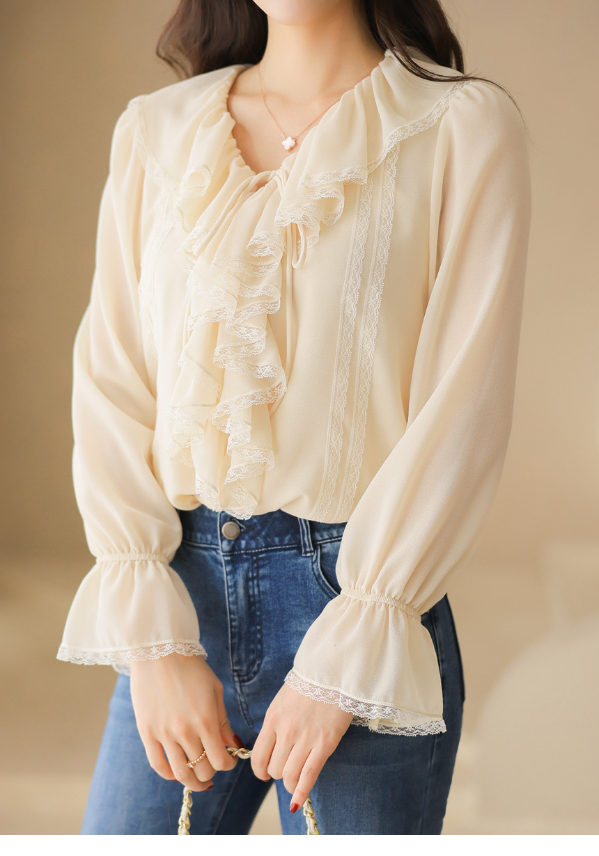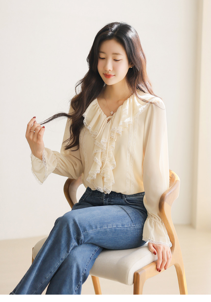 러플 넥 쉬폰 벨소매 레이스 배색 블라우스