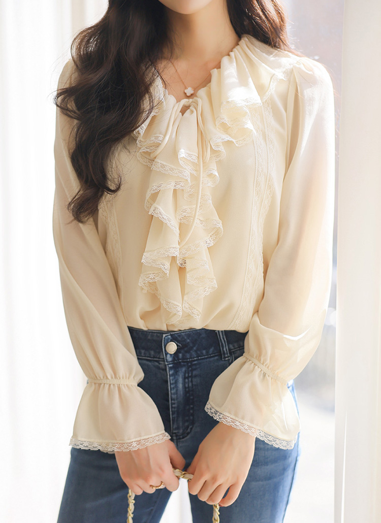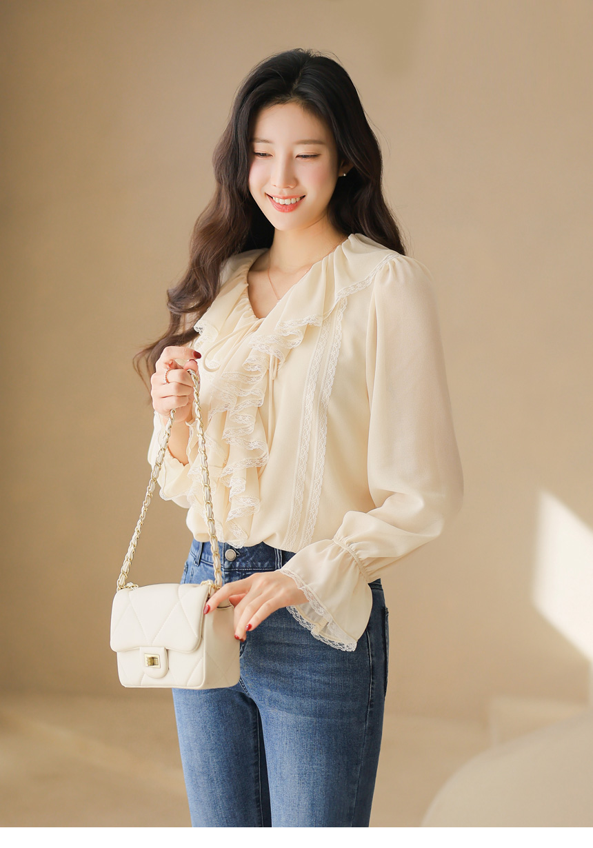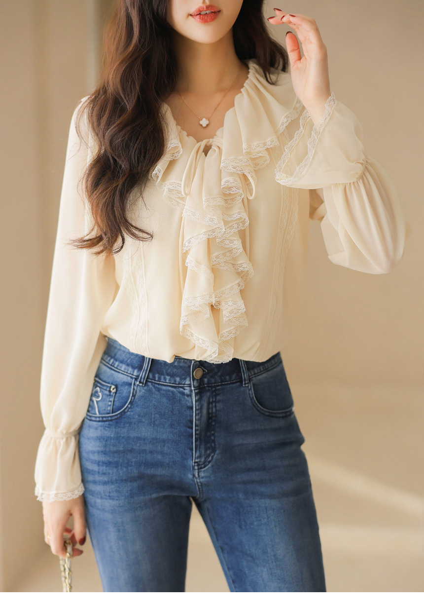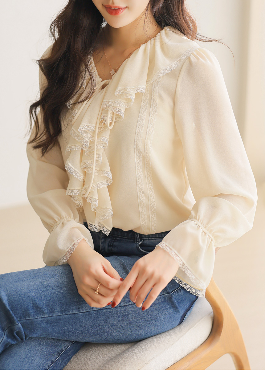 러플 넥 쉬폰 벨소매 레이스 배색 블라우스