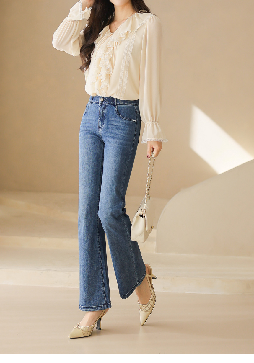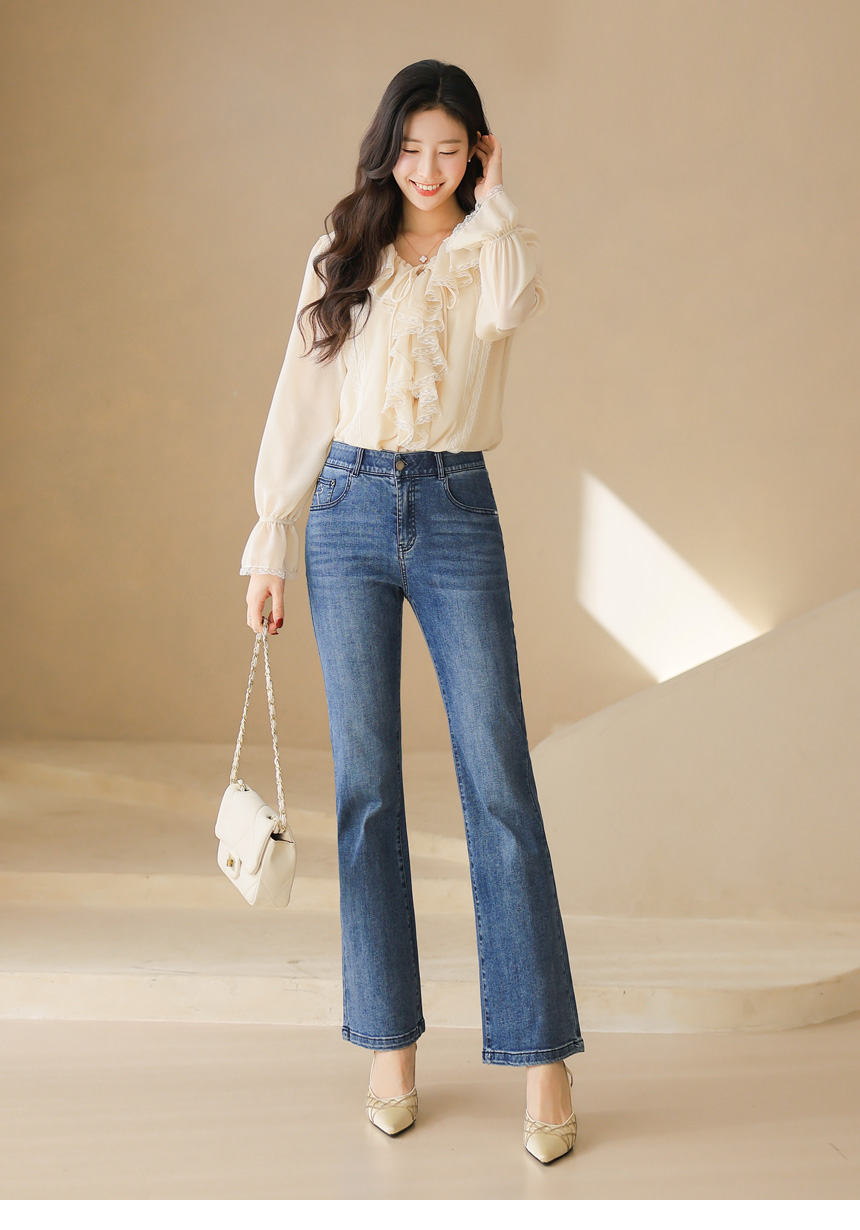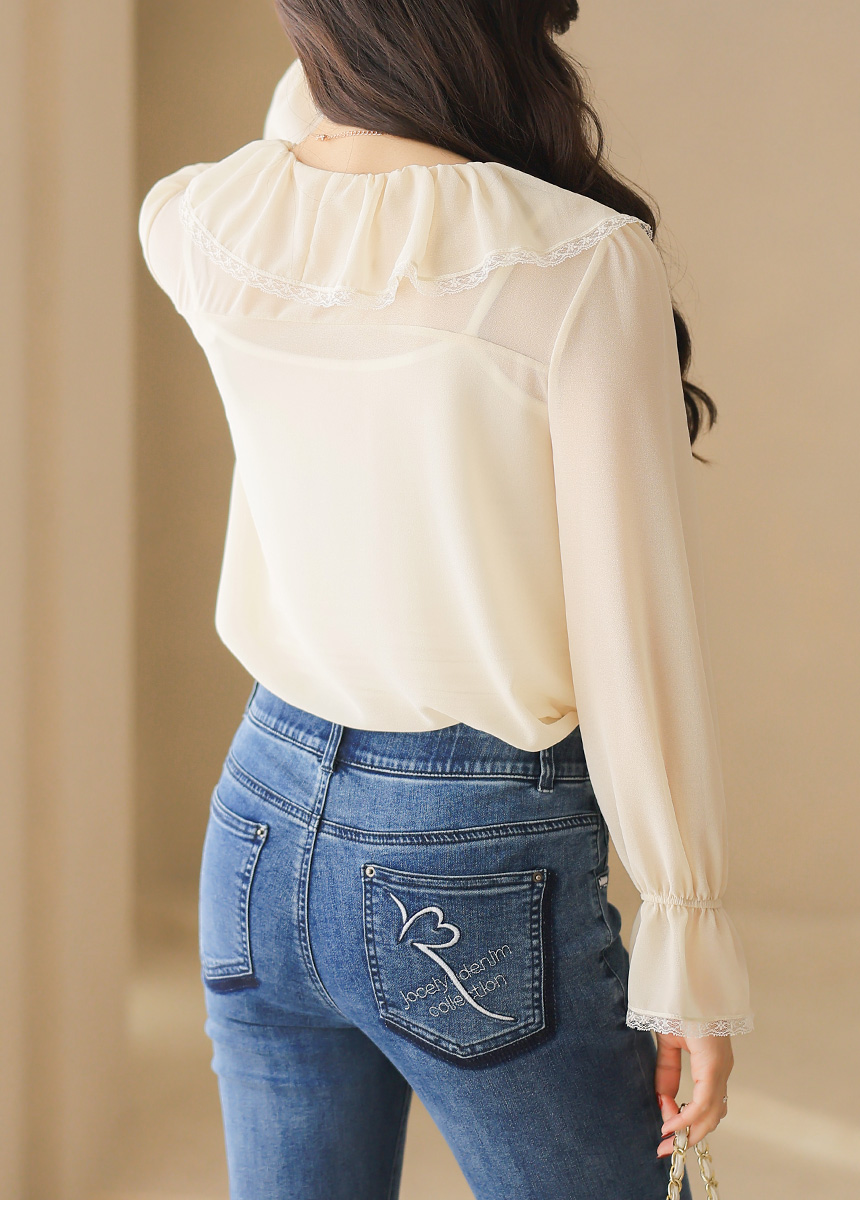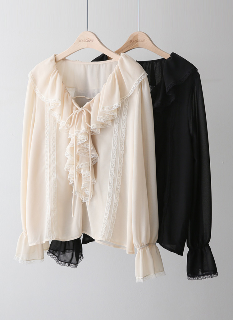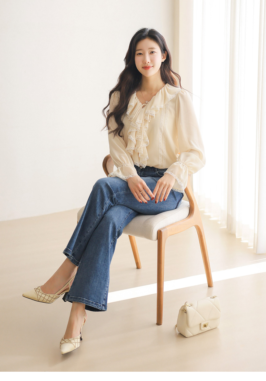 러플 넥 쉬폰 벨소매 레이스 배색 블라우스