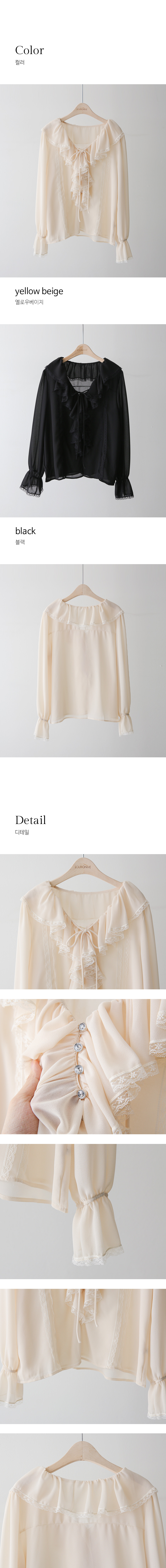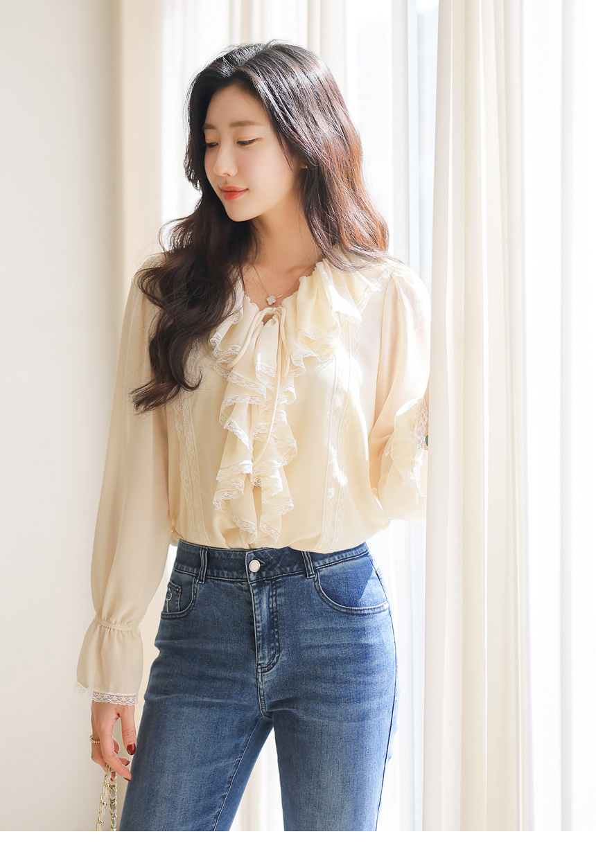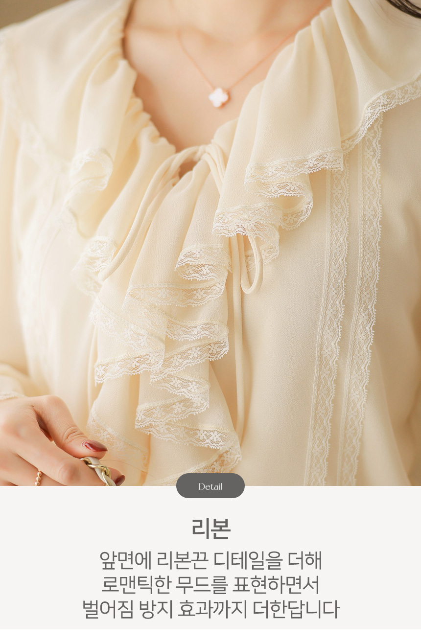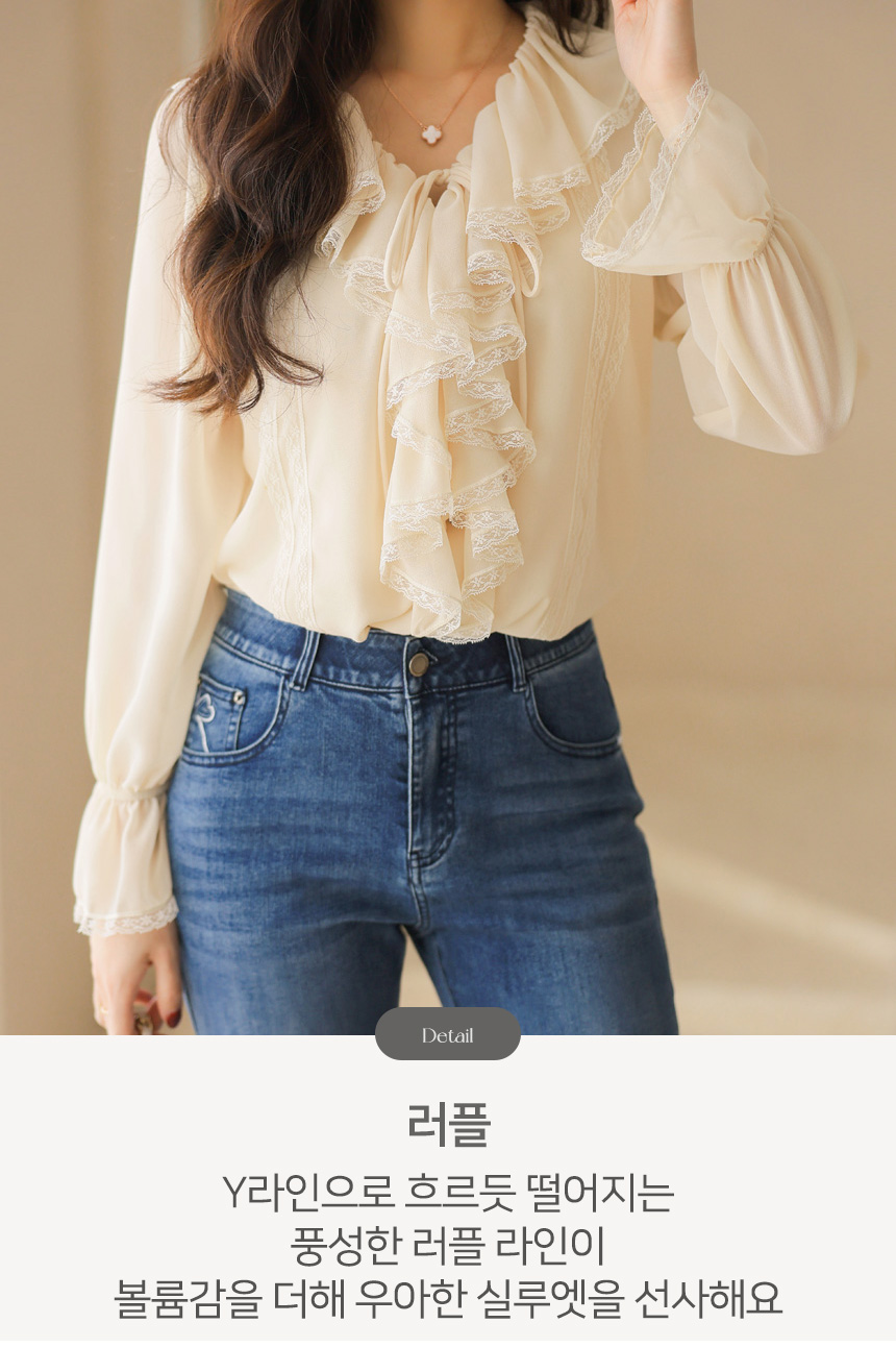 사랑스러운 디테일과 우아한 실루엣이 어우러진 러플넥 레이스 블라우스예요