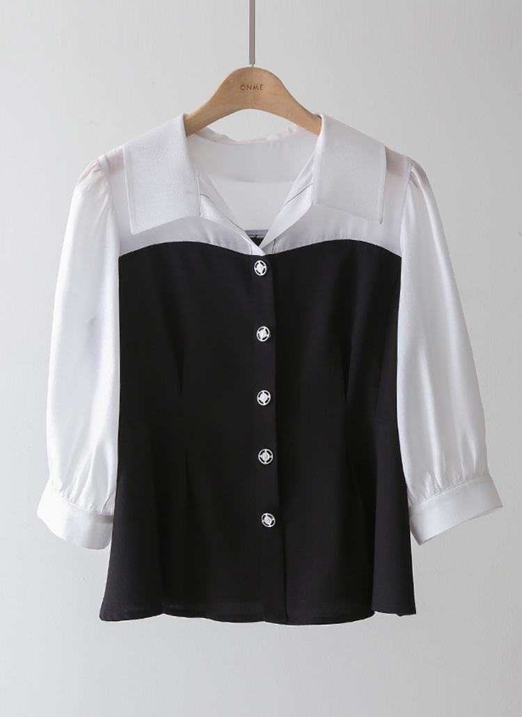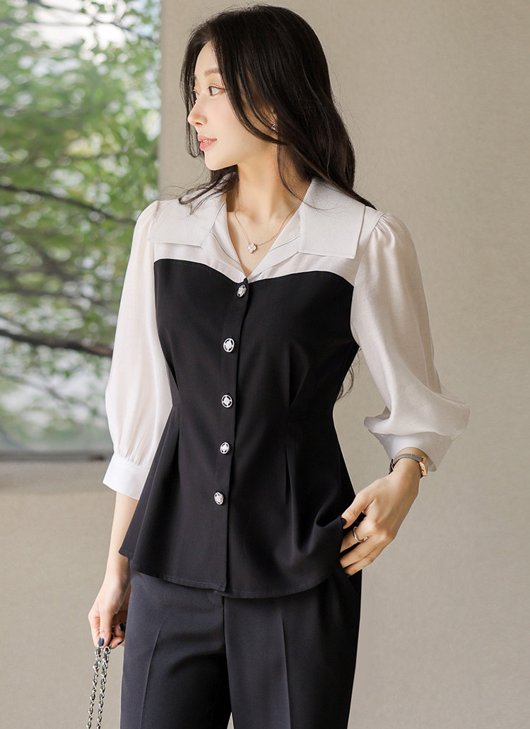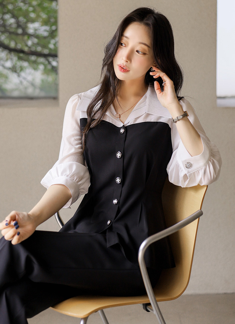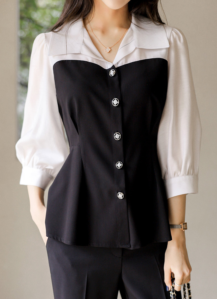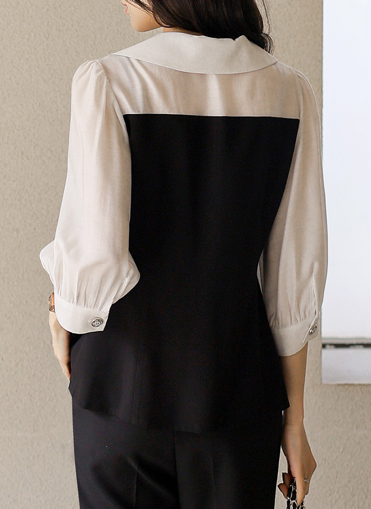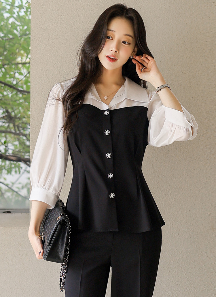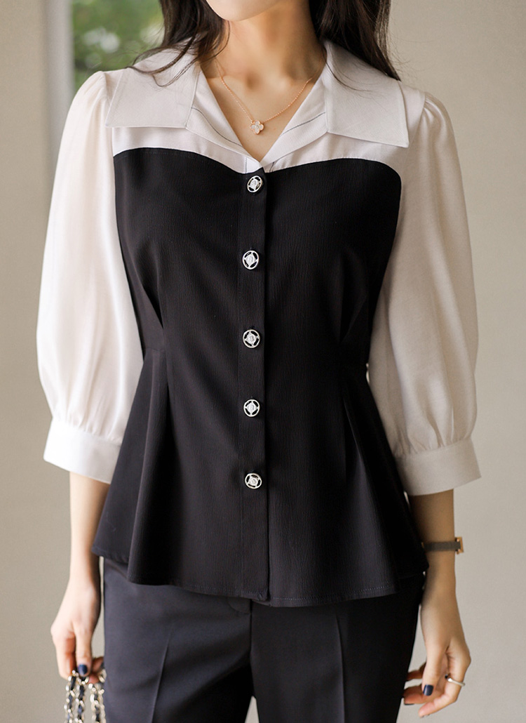 [루이스엔젤] 페플럼 하트라인 배색 스티치 포인트 시스루 퍼프소매 블라우스