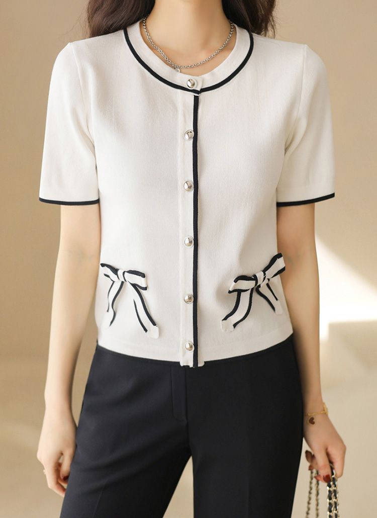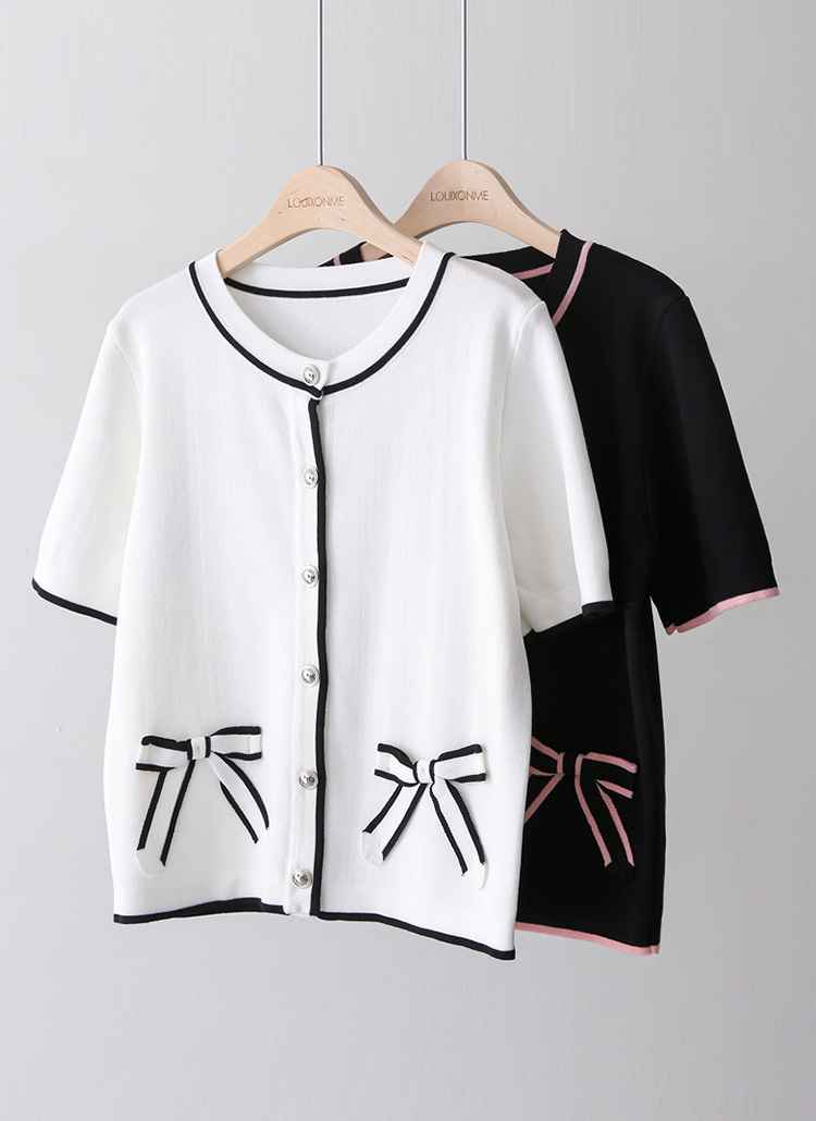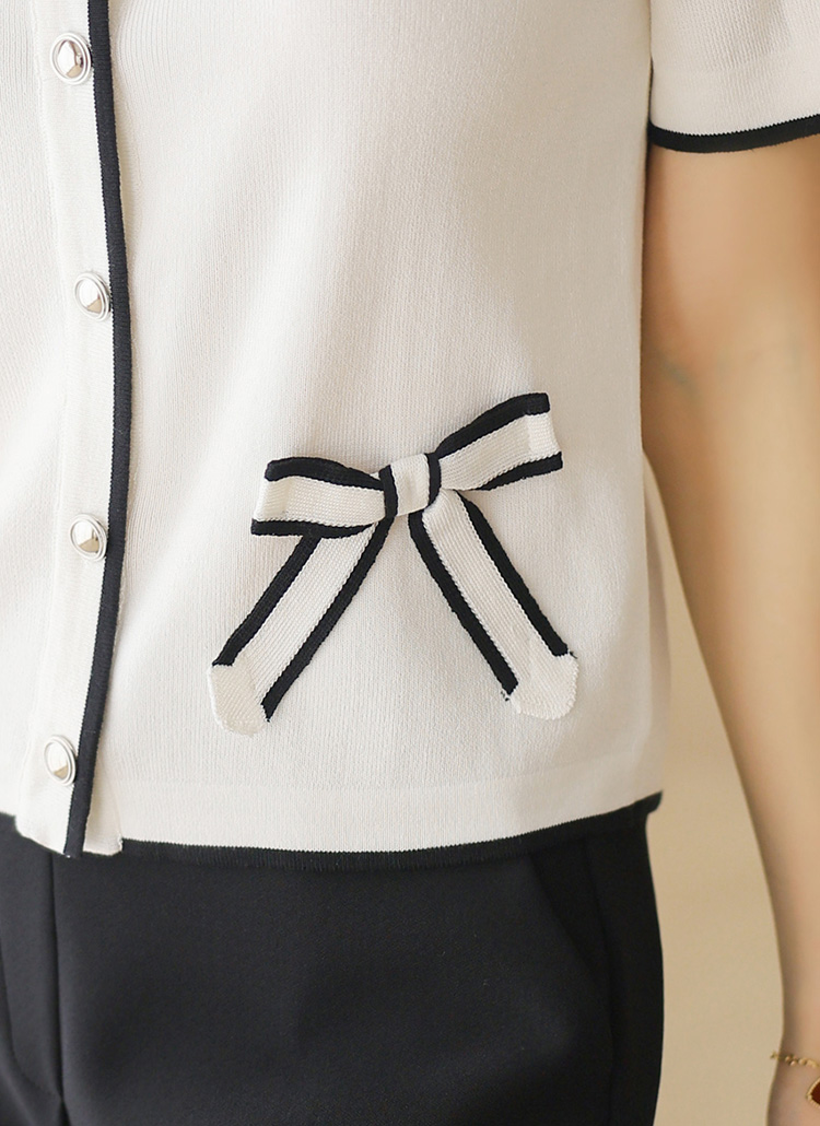 리본 디테일 라인 배색 라운드 반팔 니트 가디건