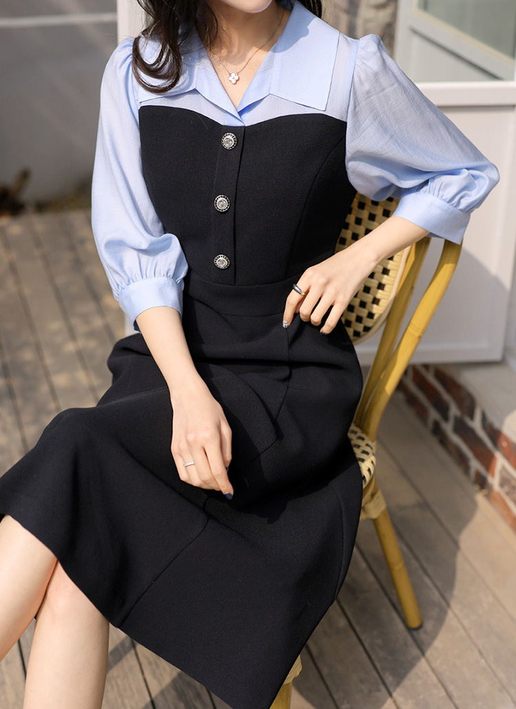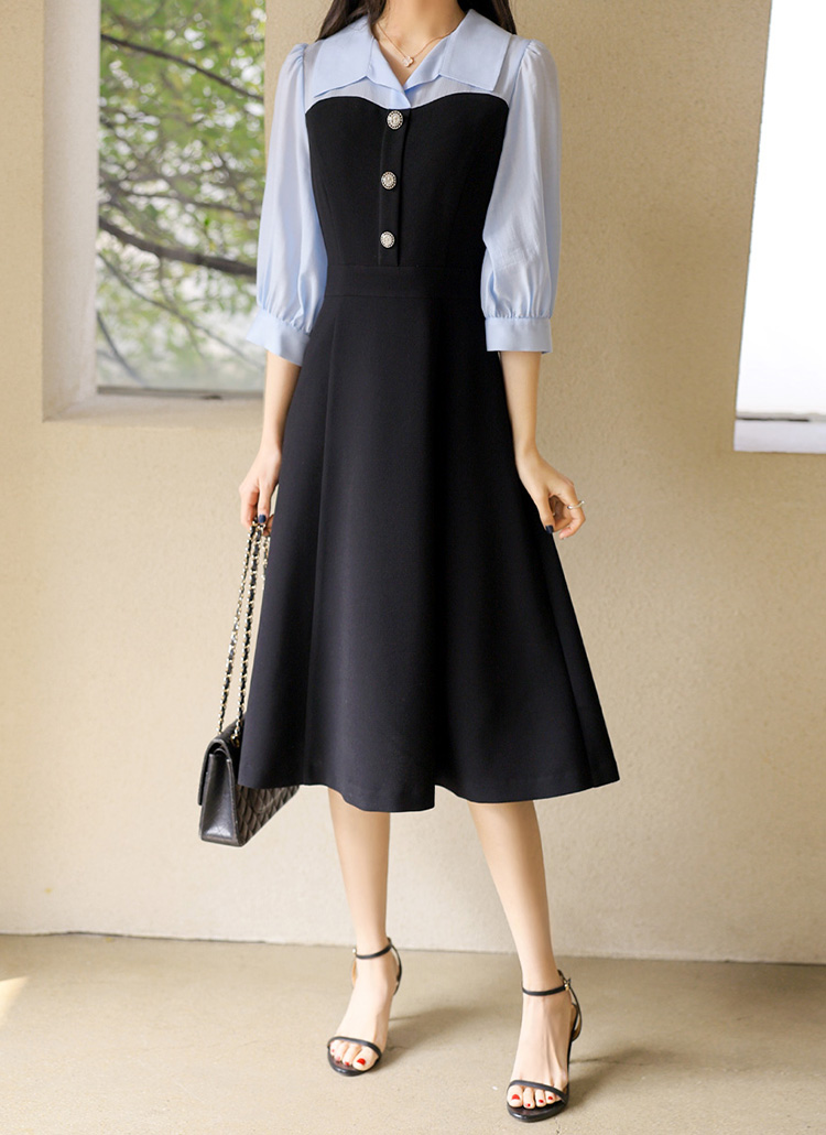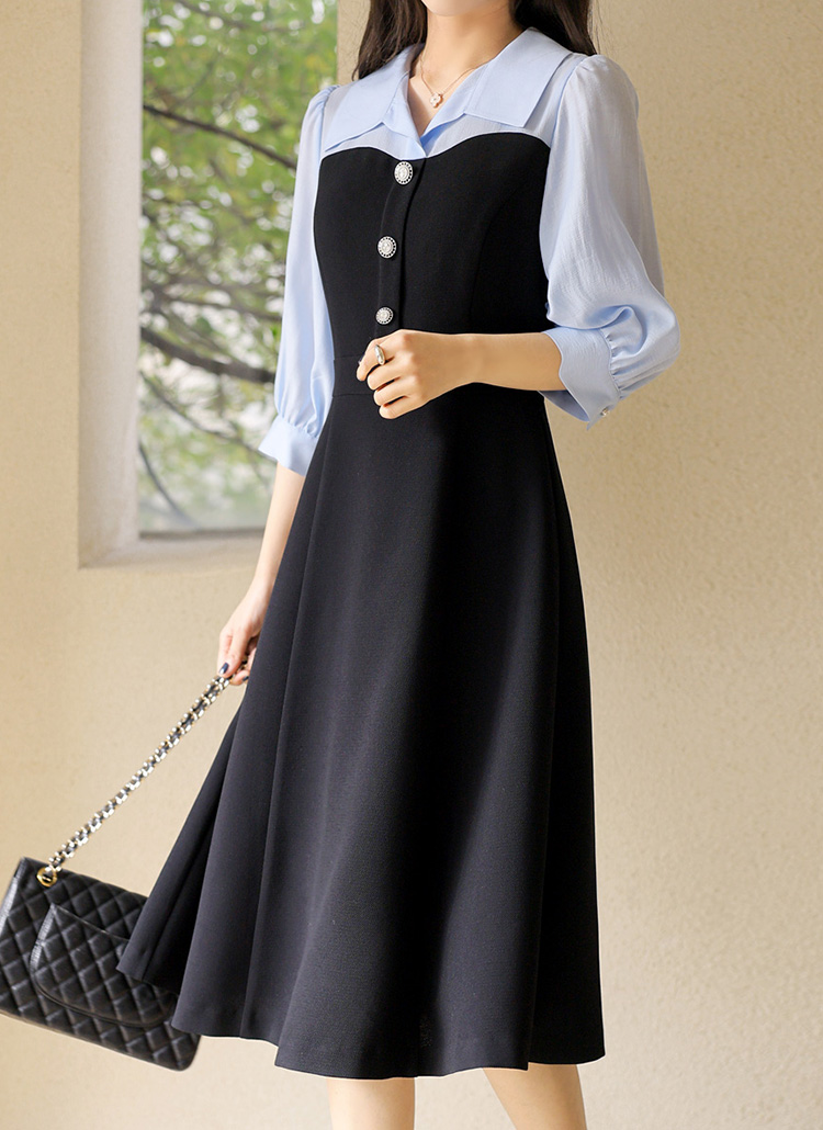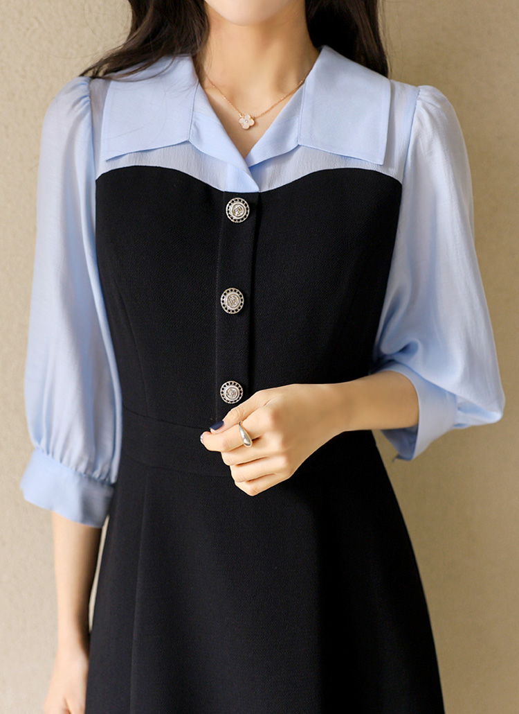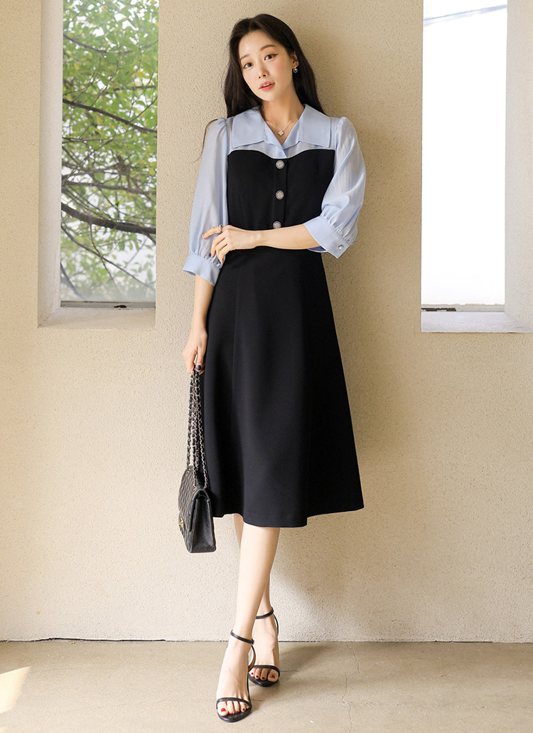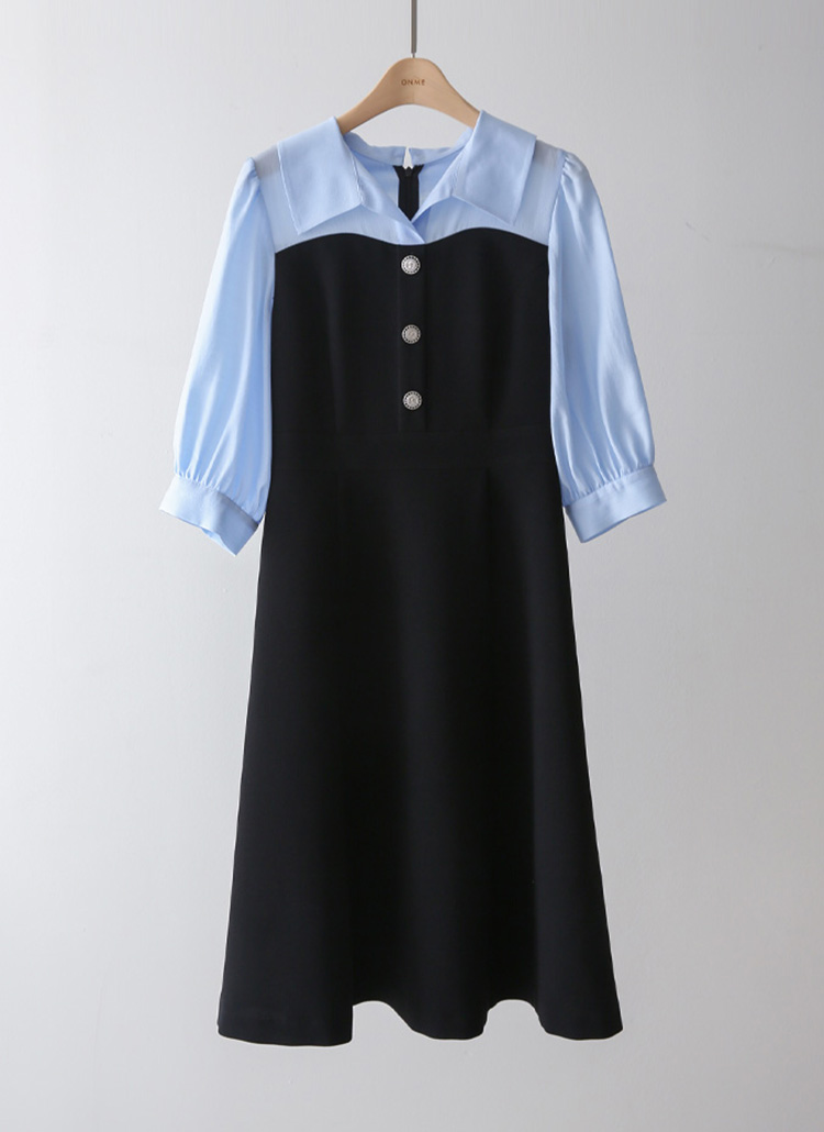 [LouisAngel] A라인 플레어 하트라인 배색 카라 퍼프 7부소매 롱 원피스