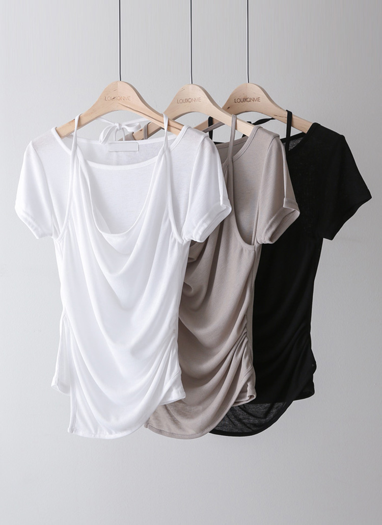 레이어드 홀터넥 옆 셔링 언발란스 밑단 슬림 티셔츠