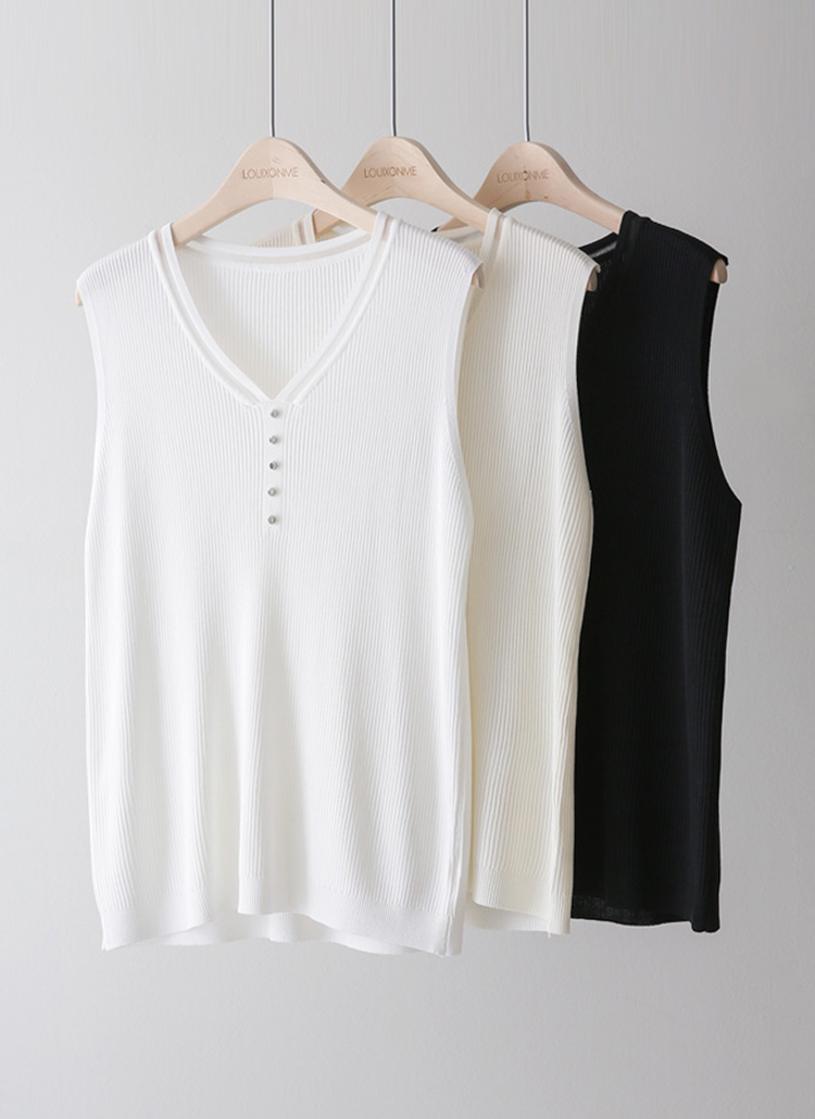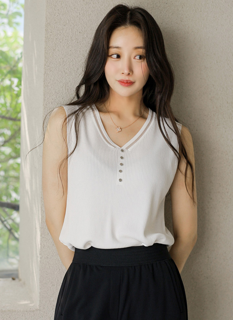시스루 배색 V넥 쿨링 터치 민소매 니트 나시