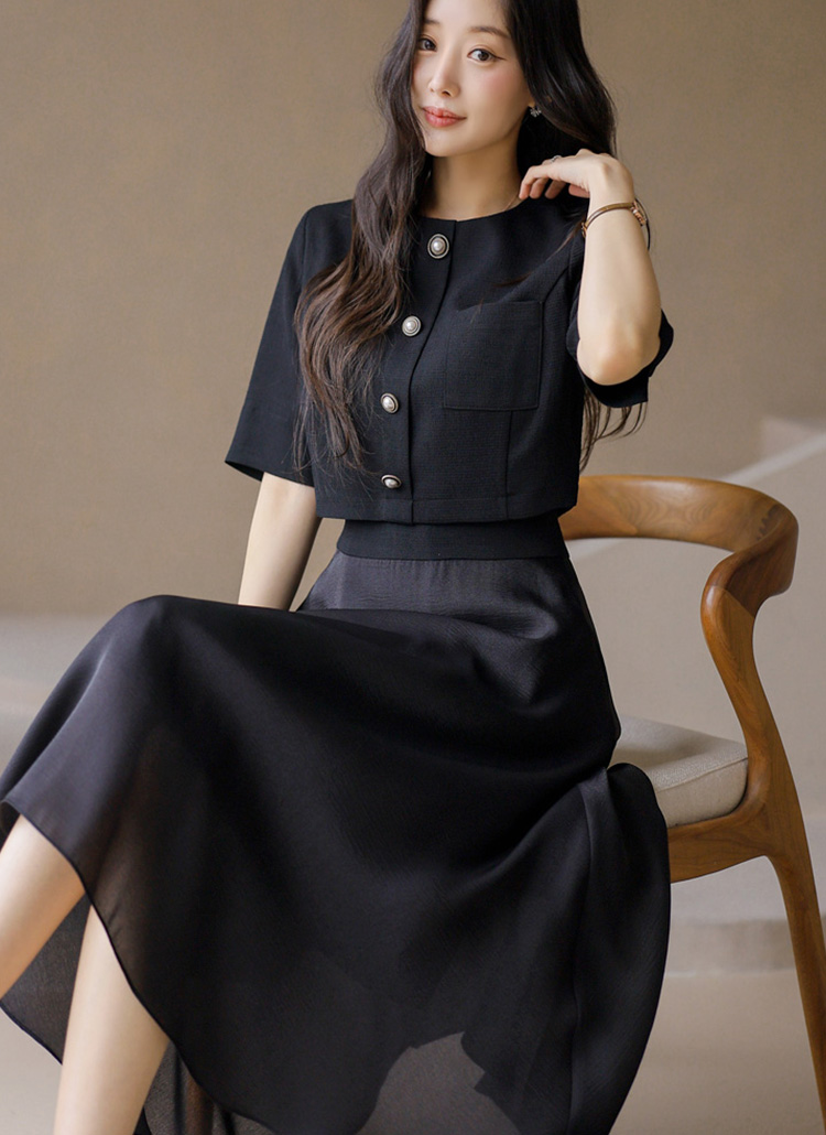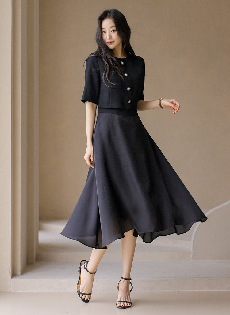 [LouisAngel] 진주 버튼 배색 디자인 A라인 플레어 롱 블랙 원피스