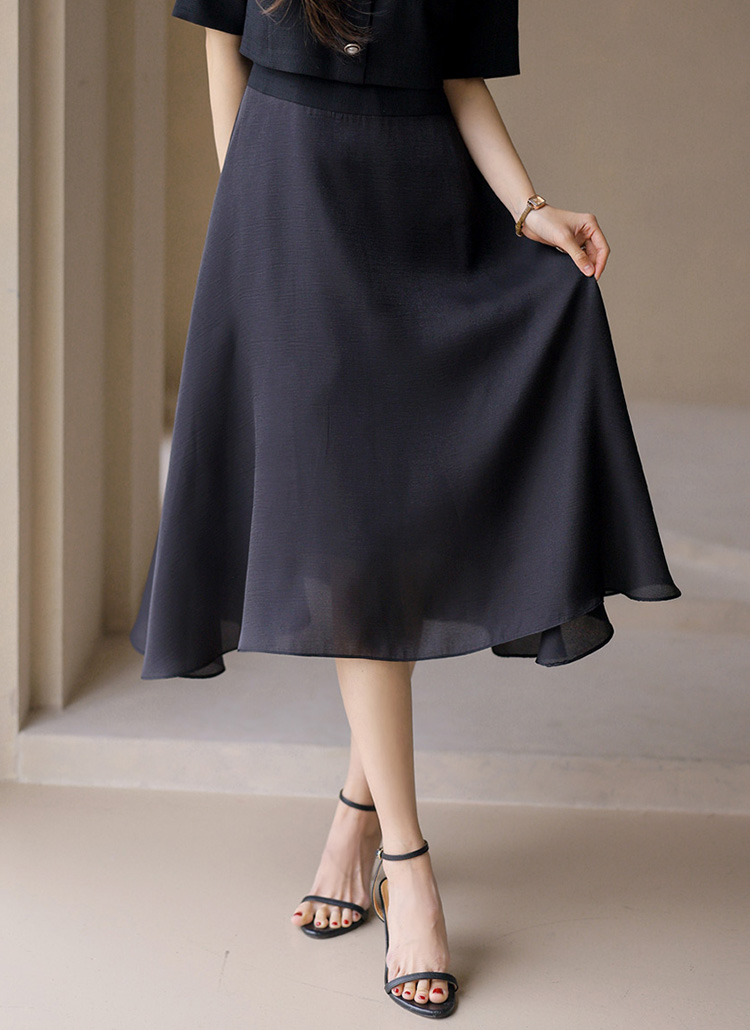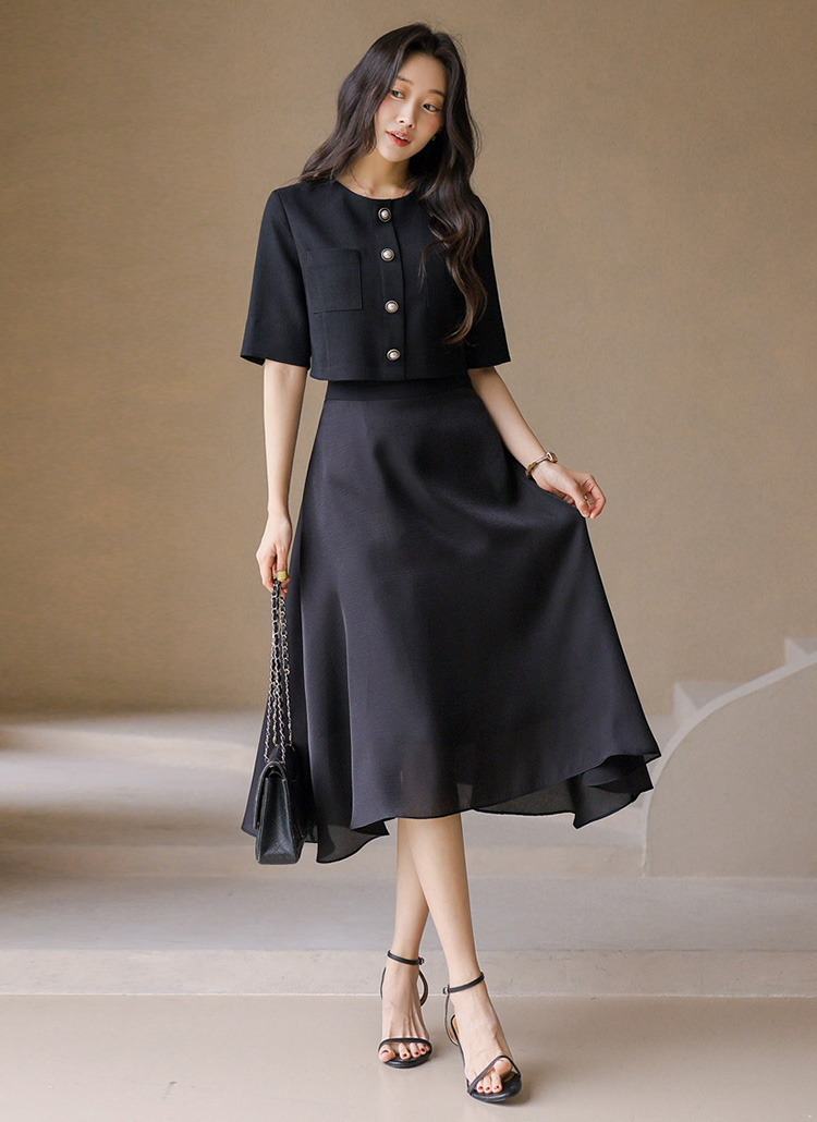 하의는 은은한 광택이 감도는 새틴 스커트를 매치한 듯 연출되어
