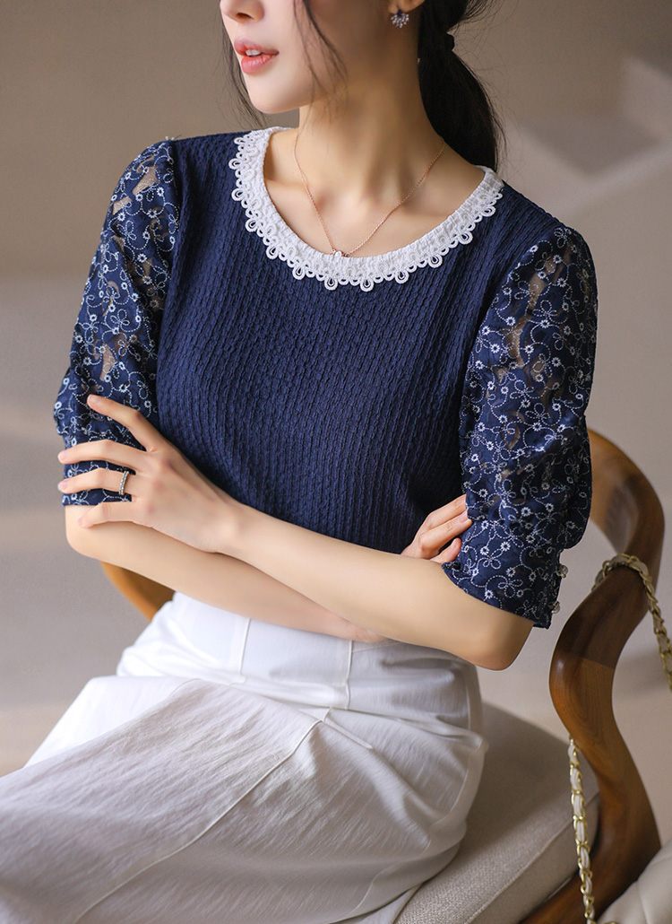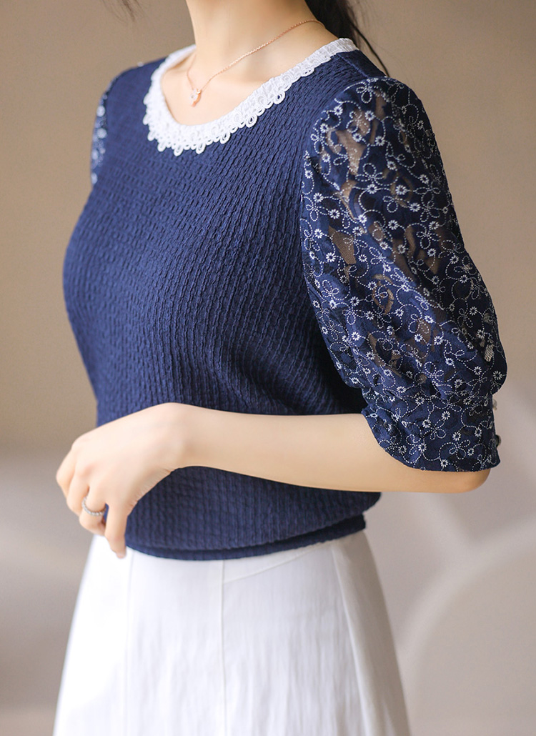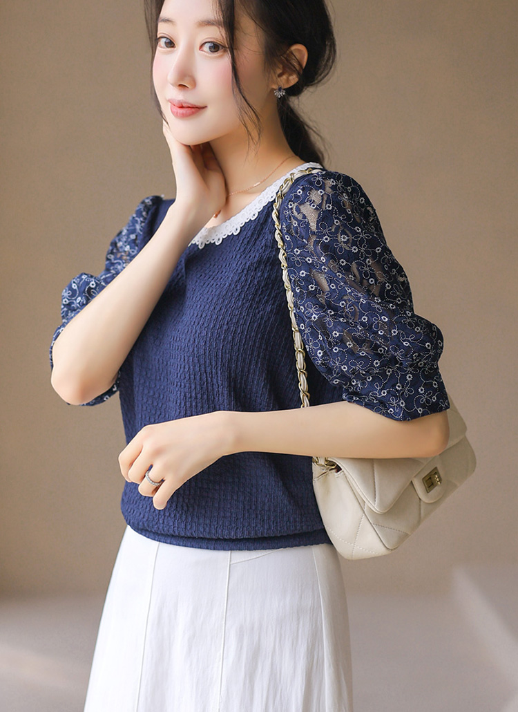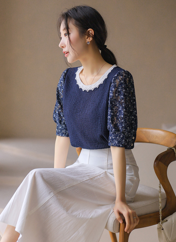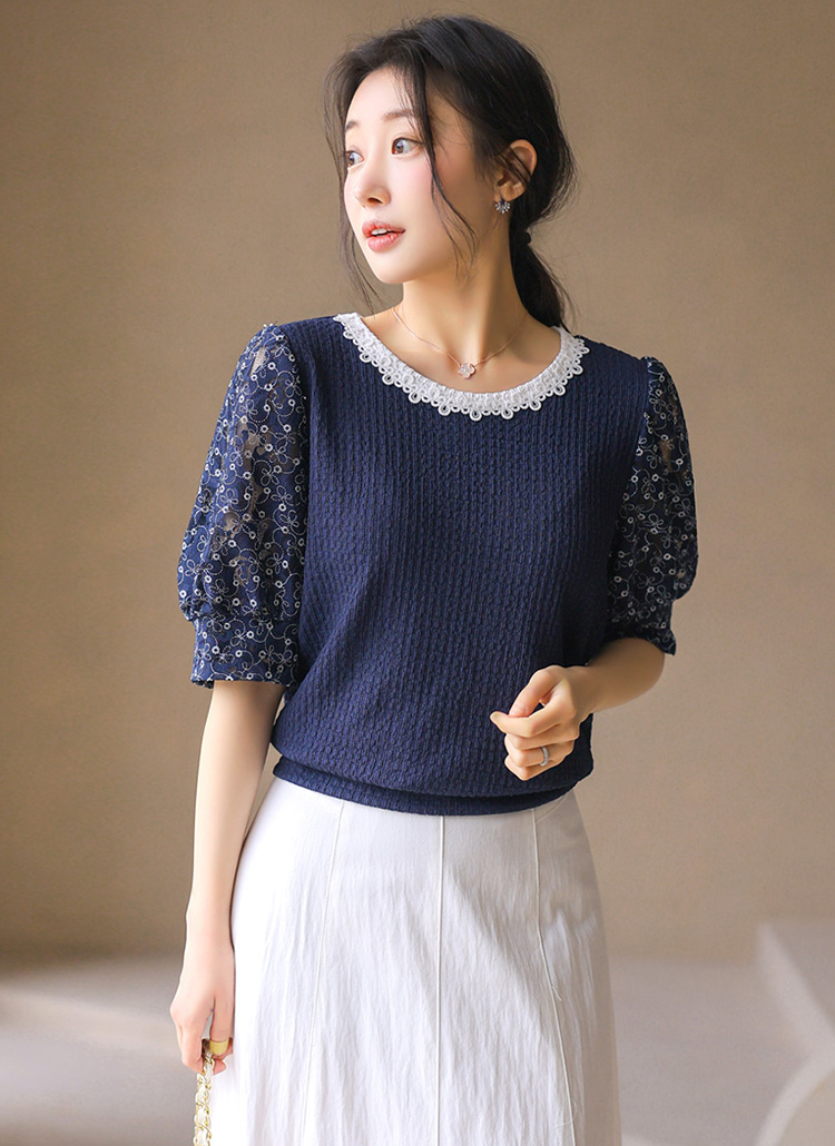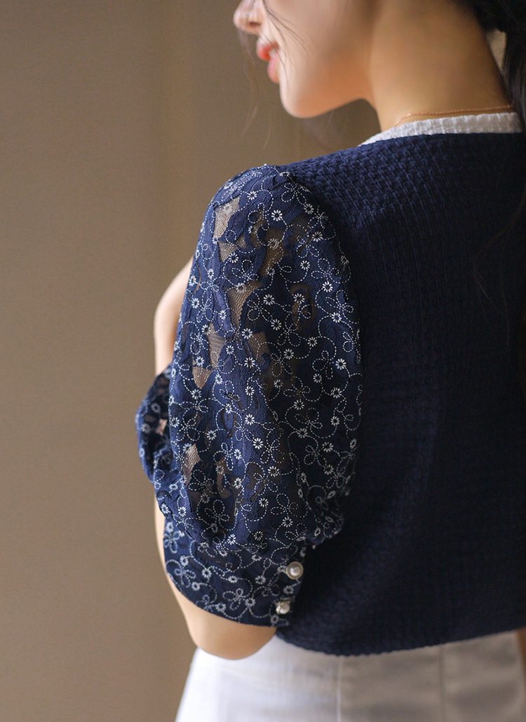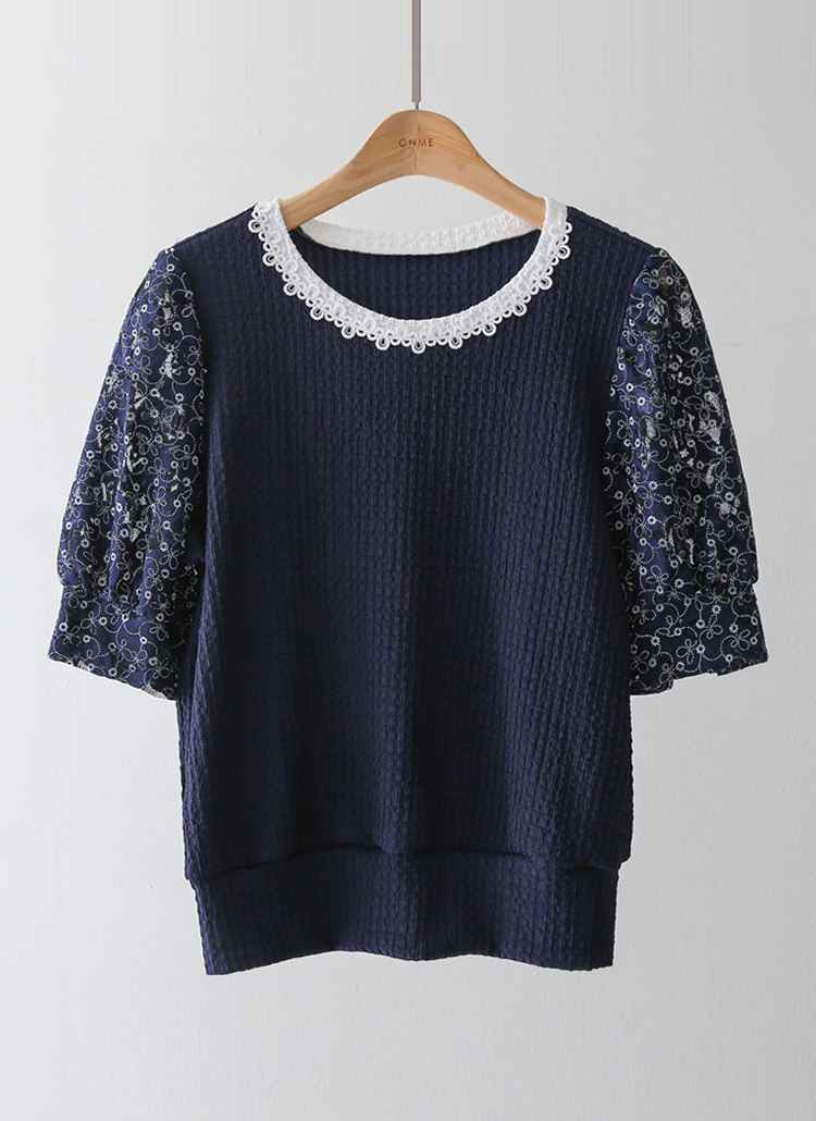 [LouisAngel] 플라워 자수 레이스 소매 배색 쟈가드 블라우스 티